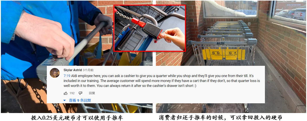 第五,購物車需要用一個硬幣來解鎖使用,使用后歸還到特定位置后,可以拿回硬幣,這就讓門店減少了員工的數(shù)量。