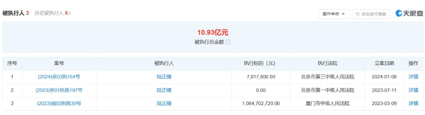 近日,陸正耀又新增了一則被執(zhí)行人信息,執(zhí)行標(biāo)的781.78萬(wàn)元,執(zhí)行法院為北京市第三中級(jí)人民法院,并且此前,陸正耀多次成被執(zhí)行人并被限制消費(fèi),根據(jù)【天眼查數(shù)據(jù)顯示】,目前陸正耀共關(guān)聯(lián)3則被執(zhí)行人信息,被執(zhí)行總金額超10.9億元。