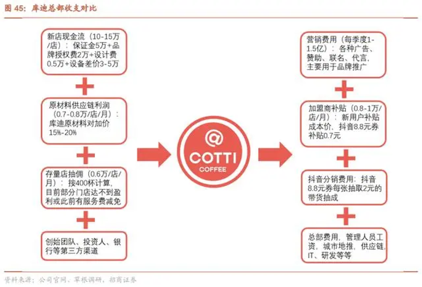 除了存量店抽傭外,庫(kù)迪的收入來(lái)源還包括新店現(xiàn)金流、原材料供應(yīng)鏈利潤(rùn)以及外部投資。