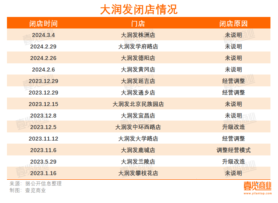 春節(jié)假期剛剛結(jié)束,就有4家大潤發(fā)宣布閉店。前身為歐尚超市的大潤發(fā)學(xué)府路店在開業(yè)13年后終于與消費(fèi)者告別,另一家開業(yè)已滿10年的大潤發(fā)德陽店也即將結(jié)束營業(yè),而開在2015年頭尾的大潤發(fā)黃岡店、大潤發(fā)株洲店也一個月內(nèi)相繼退場。大潤發(fā)目前未告知閉店的具體原因。