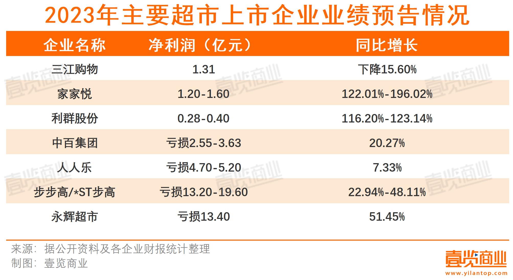 從營收數(shù)據(jù)上看,根據(jù)六家上市超市已經(jīng)發(fā)布的2023年的業(yè)績預(yù)報,除了三江購物、家家悅與利群股份是盈利狀態(tài),其他幾家大型超市企業(yè)均面臨巨額虧損,以永輝為最。2023年永輝預(yù)計虧損13.4億元,虧損金額是三江購物盈利的十倍多。