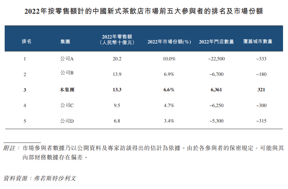 根據(jù)弗若斯特沙利文的報(bào)告,按2023年零售額計(jì)算,茶百道在中國(guó)現(xiàn)制茶飲店市場(chǎng)中排名第三,市場(chǎng)份額達(dá)到6.8%。2023年,茶百道門店的總零售額約169億元。