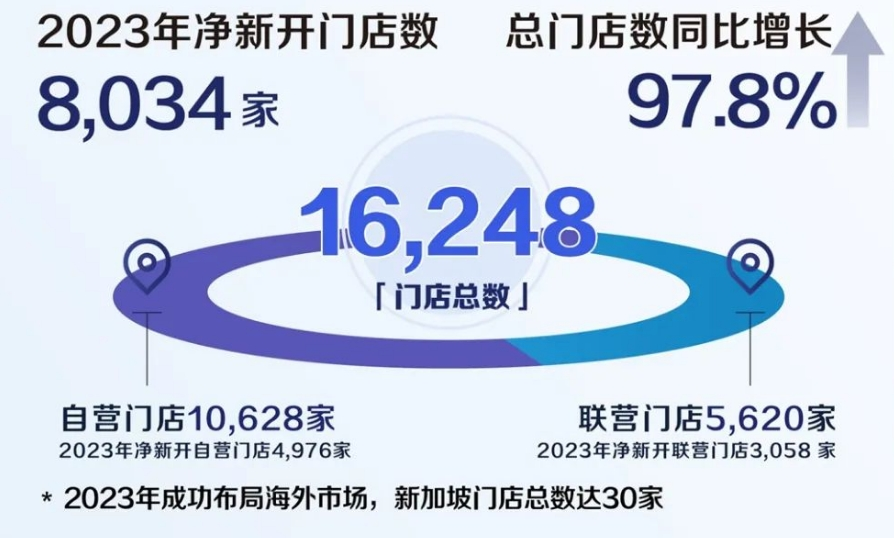 營收成績外,瑞幸的強(qiáng)勢增長也體現(xiàn)在門店規(guī)模上。在餐飲零售行業(yè),拓店速度和單店表現(xiàn)是反映商業(yè)模式正確與否最直接的指標(biāo)。瑞幸財報顯示,全年凈新開門店數(shù)超8000家,截至2023年末,門店總數(shù)量達(dá)到16248家(包含30家新加坡門店),其中自營門店數(shù)10628家,聯(lián)營門店5620家,而同期星巴克中國門店數(shù)為6975家。