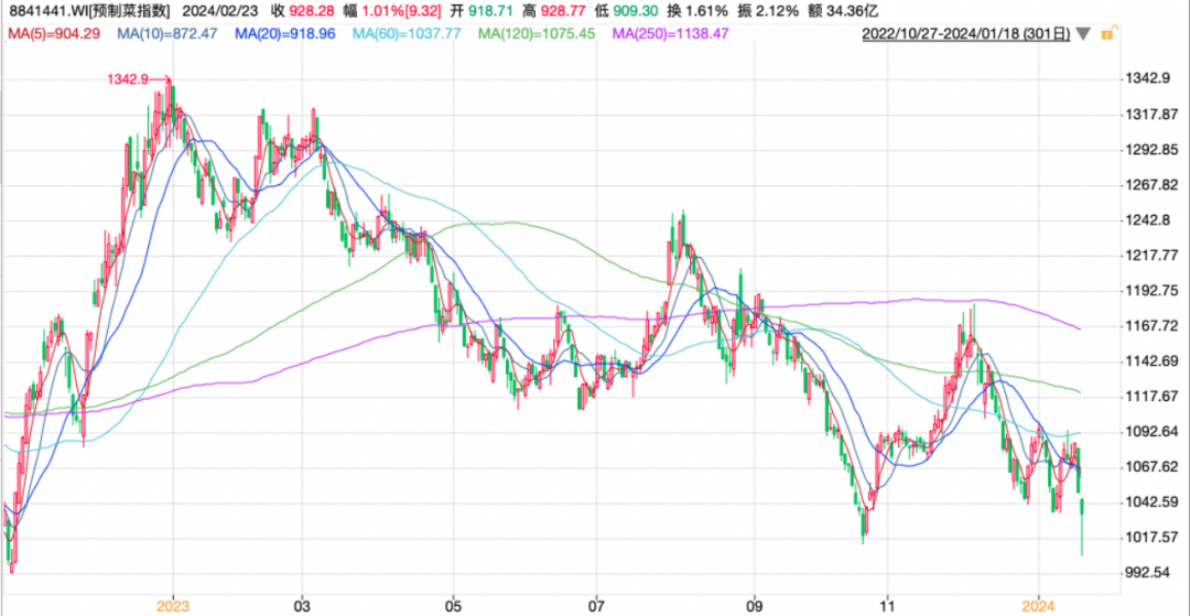 二級(jí)市場(chǎng)上,Wind預(yù)制菜板塊自2023年初后持續(xù)回調(diào),味知香、安井食品、千味央廚等多股近一年跌幅達(dá)到40%。