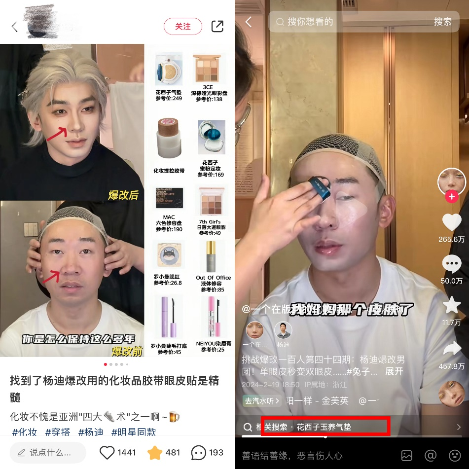相比前期的視頻,在“爆改楊迪”的這期視頻當(dāng)中,也出現(xiàn)了類似植入的情況。在給楊迪上底妝時(shí)出現(xiàn)了花西子底妝產(chǎn)品的特寫(xiě),視頻相關(guān)搜索更顯示“花西子玉養(yǎng)氣墊”。