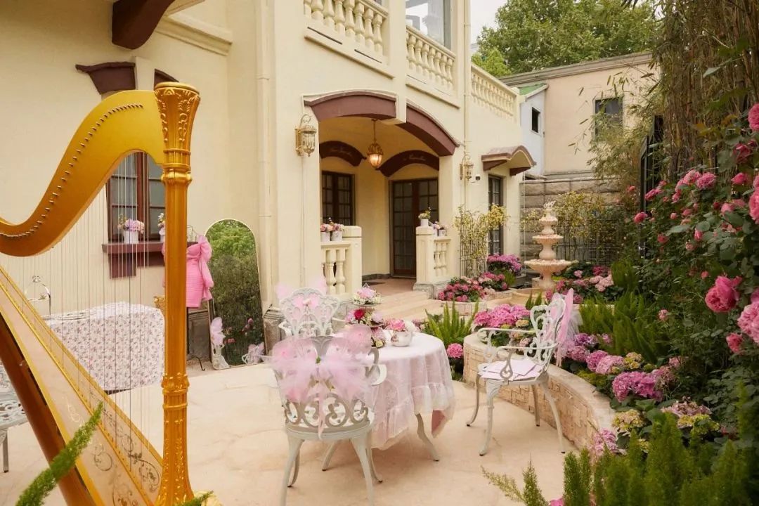 推開沿街雕花的鐵門,繁花簇?fù)淼臍W式小花園首先映入眼簾,利用建筑復(fù)古美學(xué)打造出的“夢幻試衣間”,也為品牌的西洋風(fēng)情做了加分。