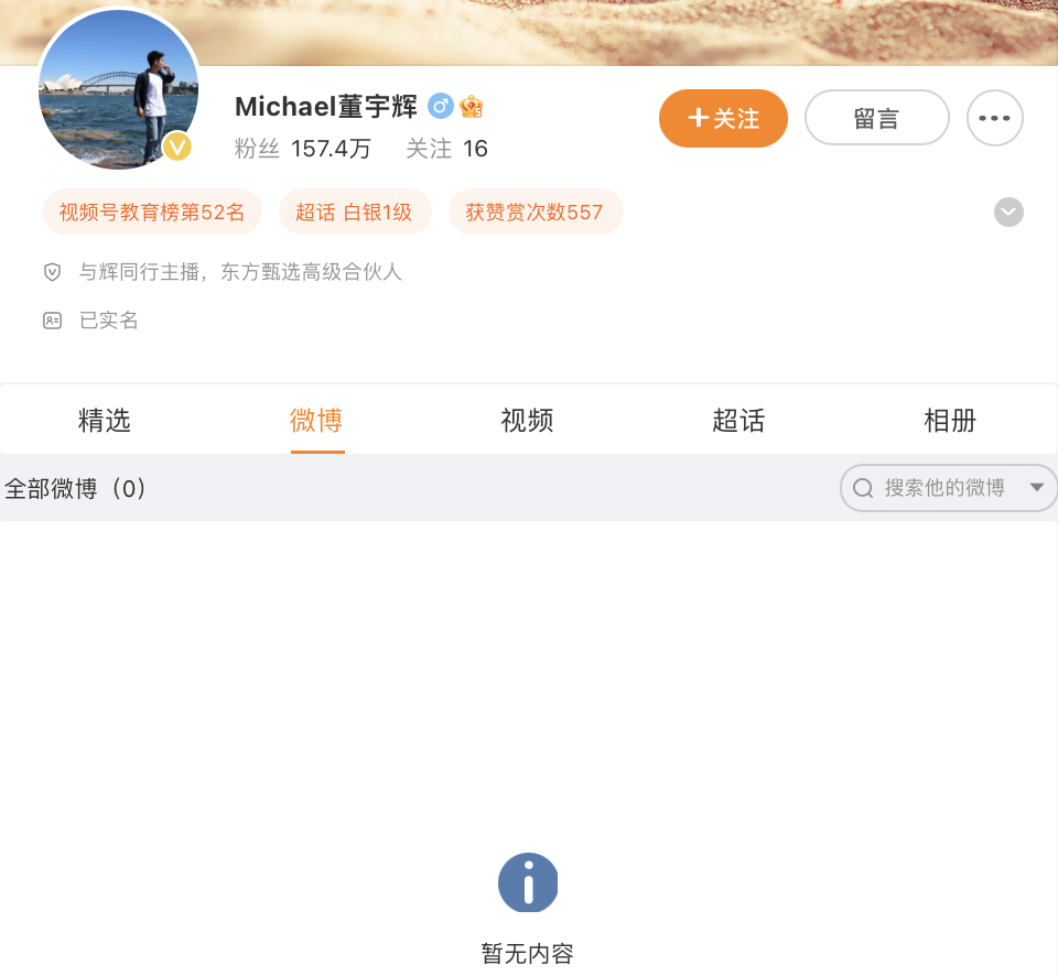 聯(lián)商快訊:2月27日,董宇輝的微博內(nèi)容已清空,頁面顯示“暫無內(nèi)容”。