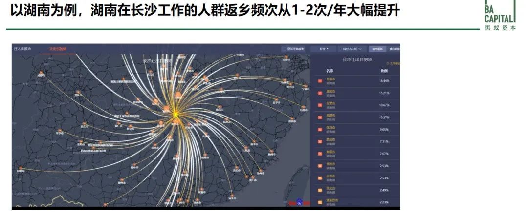 以4月30日的長沙市人口流入流出動向為例,我們會發(fā)現(xiàn)在中國很多以人口流動內(nèi)循環(huán)為主的省份,地級市進入縣城的人口流動變化很大。