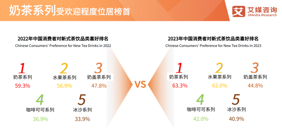 據(jù)艾媒咨詢《2024年中國新經(jīng)濟行業(yè)全景解讀》報告顯示,在奶茶系列中,消費者對奶蓋茶的喜愛度從47.8%下降到44.8%,而對水果茶、可可咖啡等的喜愛都有一定幅度的上升。