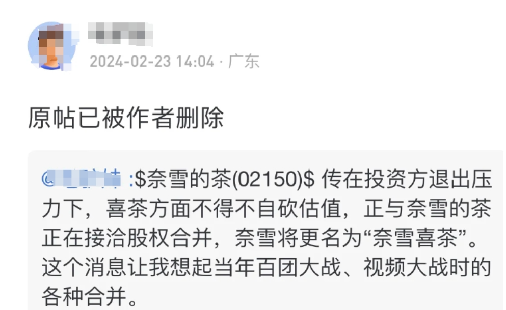 人有多大膽,地有多大產(chǎn)。前幾天,網(wǎng)絡(luò)上還傳出謠言“奈雪的茶傳在投資方退出壓力下,喜茶方面不得不自砍估值,正與奈雪的茶接洽股權(quán)合并,奈雪將更名為‘奈雪喜茶’!苯刂涟l(fā)稿前,此帖已經(jīng)刪除,但已經(jīng)引起了不小的轟動。