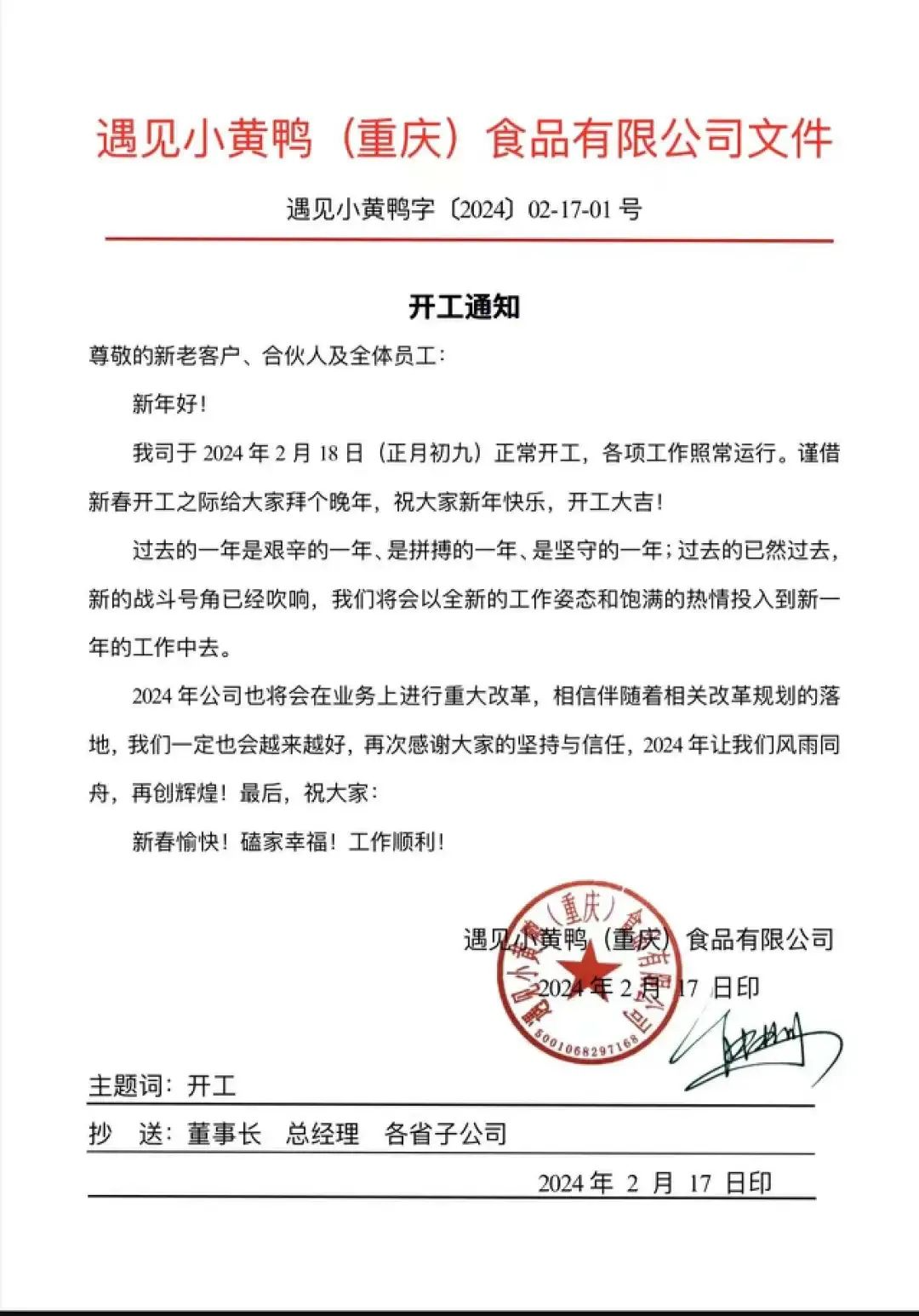 在2024年2月18日的時(shí)候,遇見(jiàn)·小黃鴨還曾發(fā)布開(kāi)工通知,并附上董事長(zhǎng)熊億川簽名,抄送至全國(guó)省市子公司。但目前,其加盟熱線(xiàn)電話(huà)已關(guān)機(jī),無(wú)法接通。