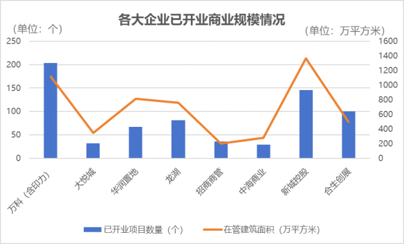 對(duì)比同行數(shù)據(jù),萬(wàn)科系已開(kāi)業(yè)項(xiàng)目數(shù)量、在管建筑規(guī)模均排在前列,較華潤(rùn)置地、龍湖、大悅城等高一些。