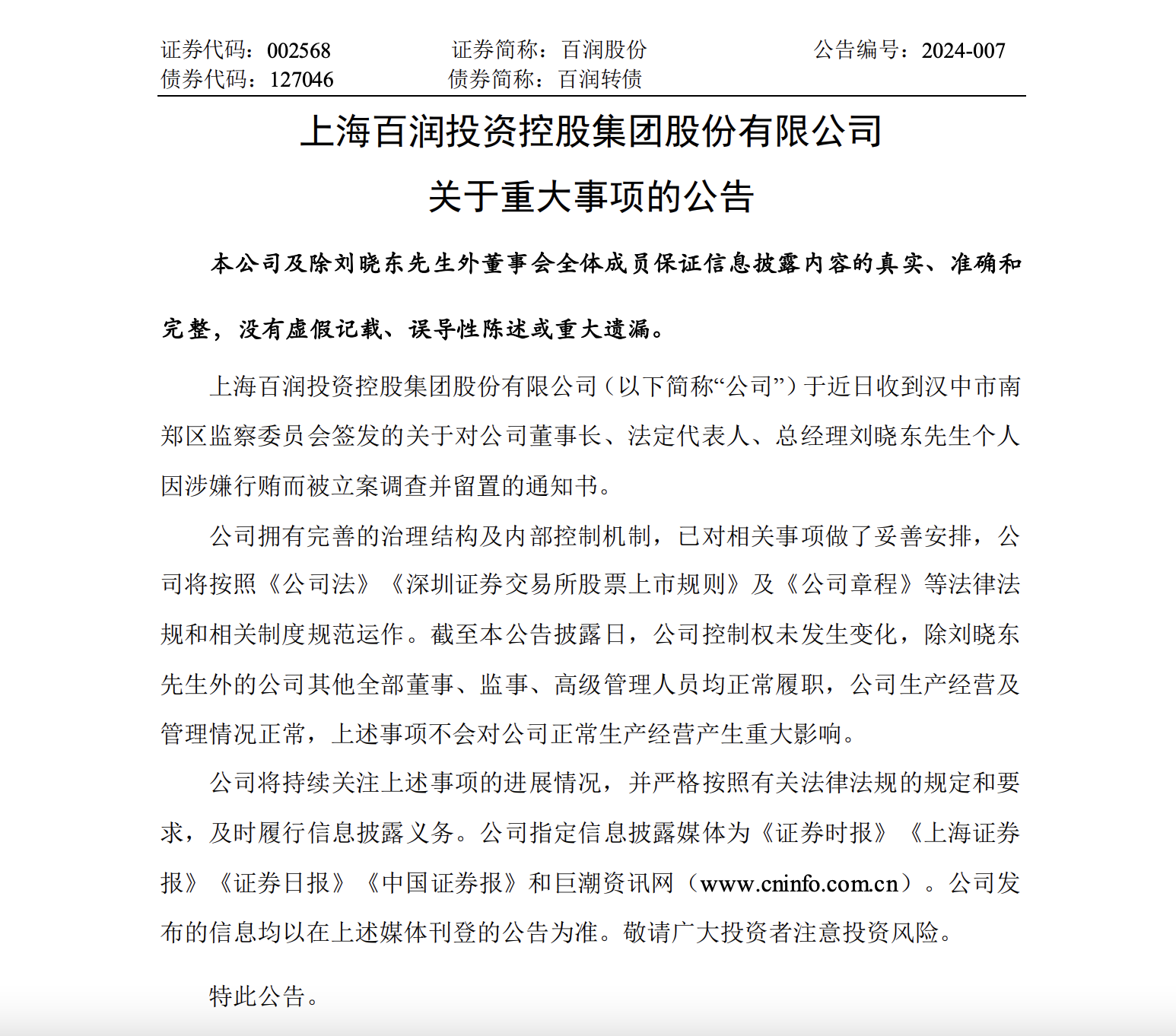 聯(lián)商快訊:2月27日,上海百潤股份發(fā)布重大事項公告稱,公司于近日收到陜西省漢中市南鄭區(qū)監(jiān)察委員會簽發(fā)的關(guān)于對公司董事長、法定代表人、總經(jīng)理劉曉東個人因涉嫌行賄而被立案調(diào)查并留置的通知書。
