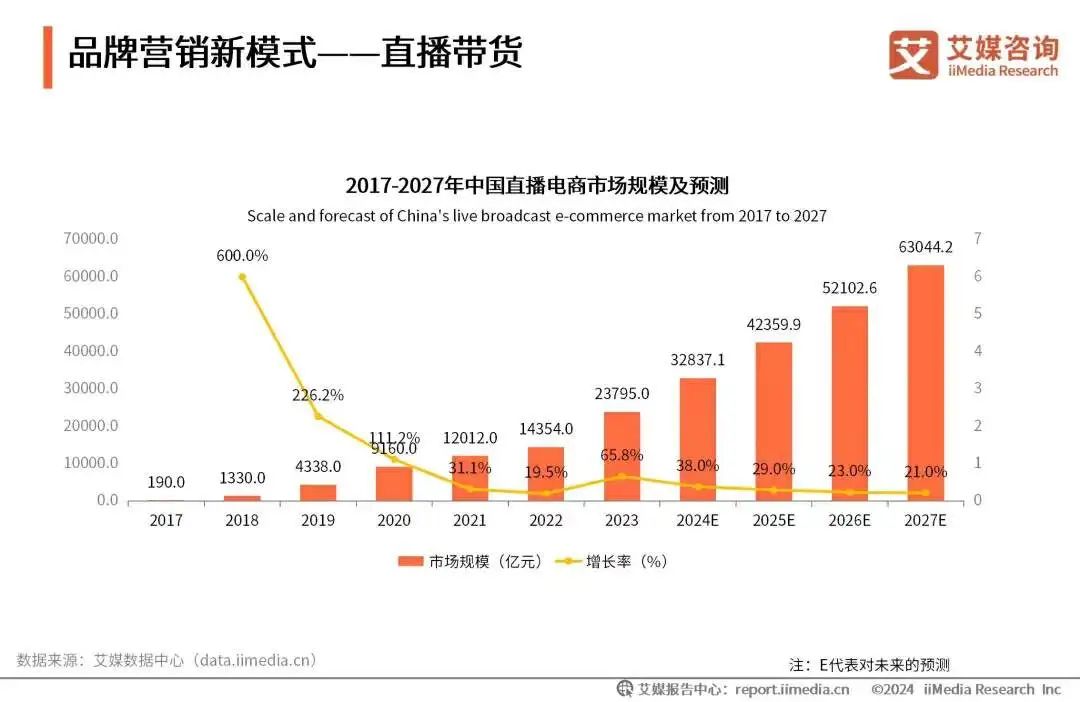 據(jù)艾媒咨詢數(shù)據(jù)顯示,我國直播電商市場規(guī)模從2017年的190億已經(jīng)快速增長到2023年的近2.4萬億,按照這一趨勢預(yù)計到2027年將正式突破6萬億大關(guān)。面對廣闊的市場前景,在電商平臺競爭更加激烈的2024年,淘寶顯然不想成為“掉隊者”。