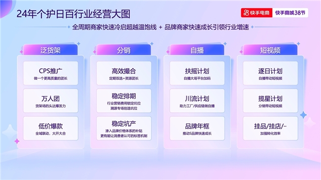 2023年,快手電商個(gè)護(hù)日百行業(yè)自播占比持續(xù)提升,貨架場(chǎng)穩(wěn)步增長(zhǎng),短視頻掛車掛店引流效果顯著。在此基礎(chǔ)上,今年38節(jié)大促,快手電商將圍繞泛貨架、分銷、自播、短視頻四個(gè)方面,推出一系列玩法和扶持政策,助力全周期商家快速冷啟成長(zhǎng),讓品牌商家引領(lǐng)行業(yè)增速。
