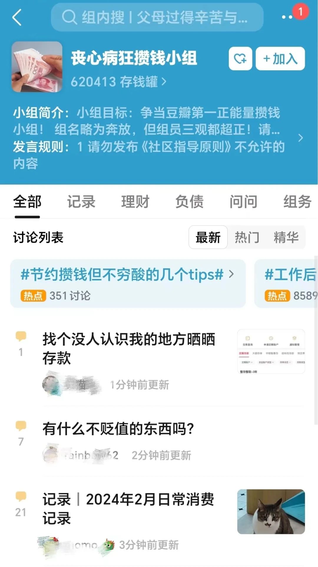 在豆瓣平臺(tái)上,兩個(gè)引人注目的小組——“喪心病狂攢錢小組”和“今天消費(fèi)降級了嗎”小組,分別匯聚了約62萬和36萬的成員。