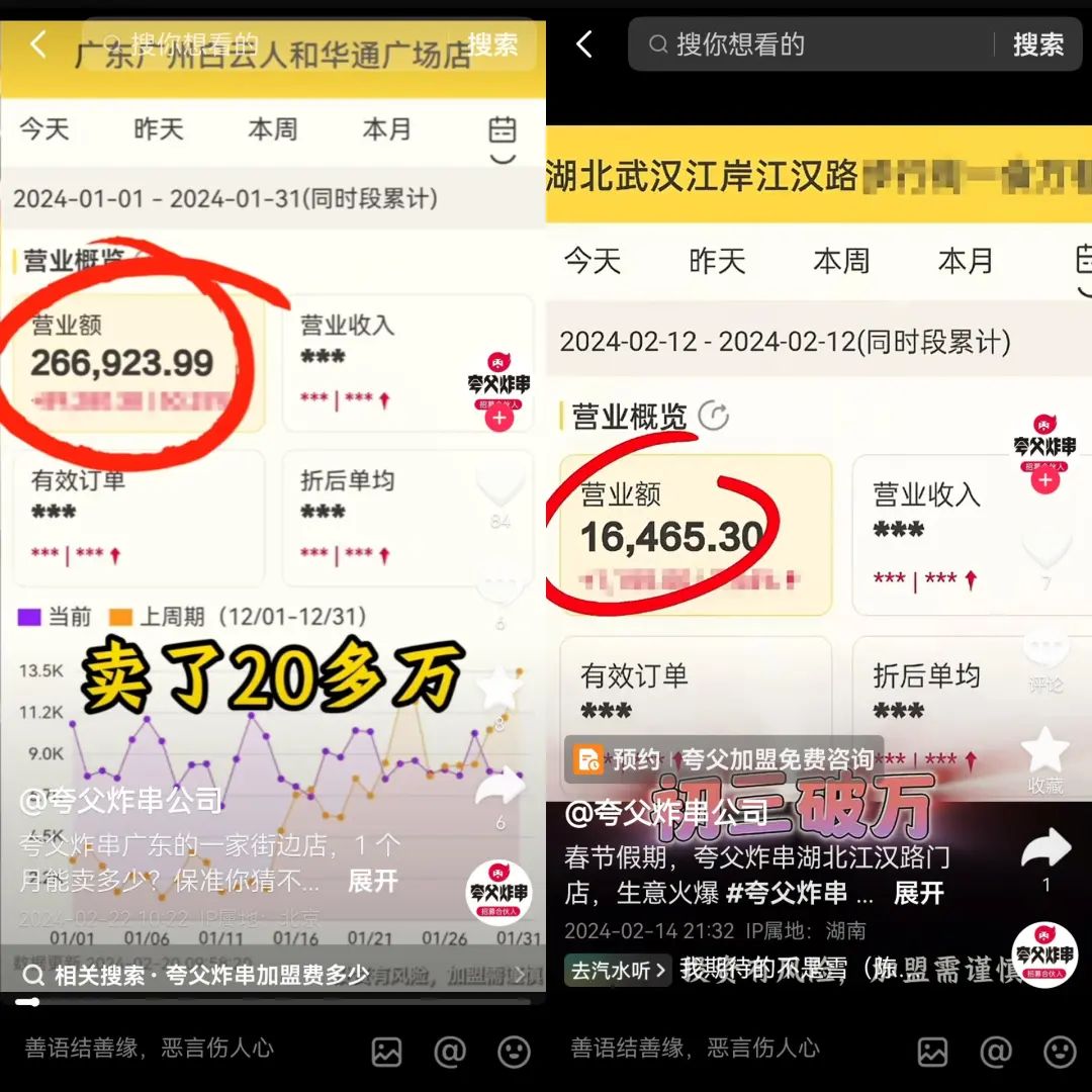 在微信公眾號和抖音等社交平臺上,夸父炸串官方時(shí)不時(shí)還會更新各式加盟商創(chuàng)業(yè)成功的故事,日營業(yè)額破萬,一個(gè)月賣出20多萬,三家門店月營業(yè)額破40萬元等故事吸引了不少視線,也讓更多創(chuàng)業(yè)者蠢蠢欲動。