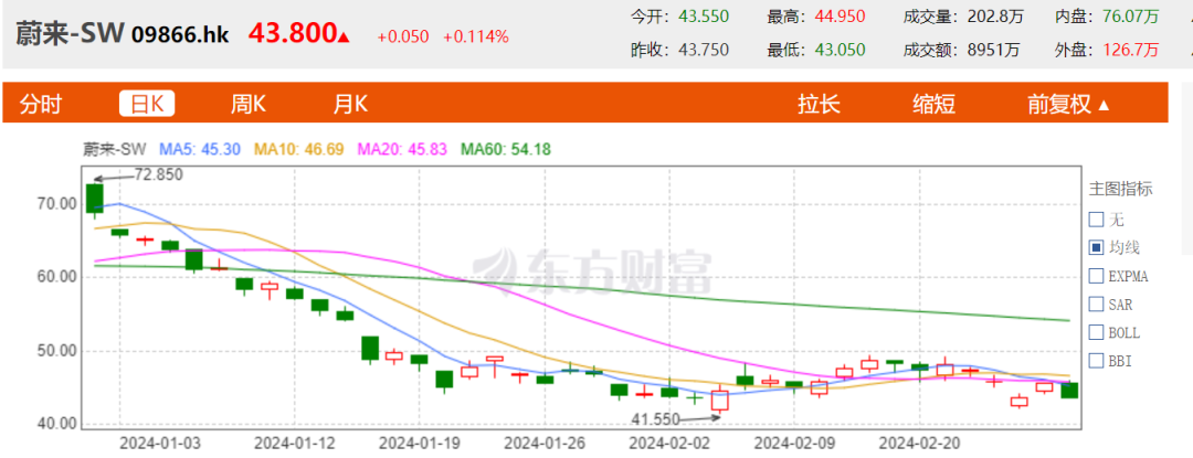 伴隨上述諸多“降級(jí)”信號(hào)的是,蔚來汽車的股價(jià)在2024年開始至2月29日,已經(jīng)從約72港元/股下降至43.8港元/股,開年2個(gè)月累計(jì)降幅已達(dá)39.79%,最新港股市值約687.9億港元,約為理想汽車總市值的22%。