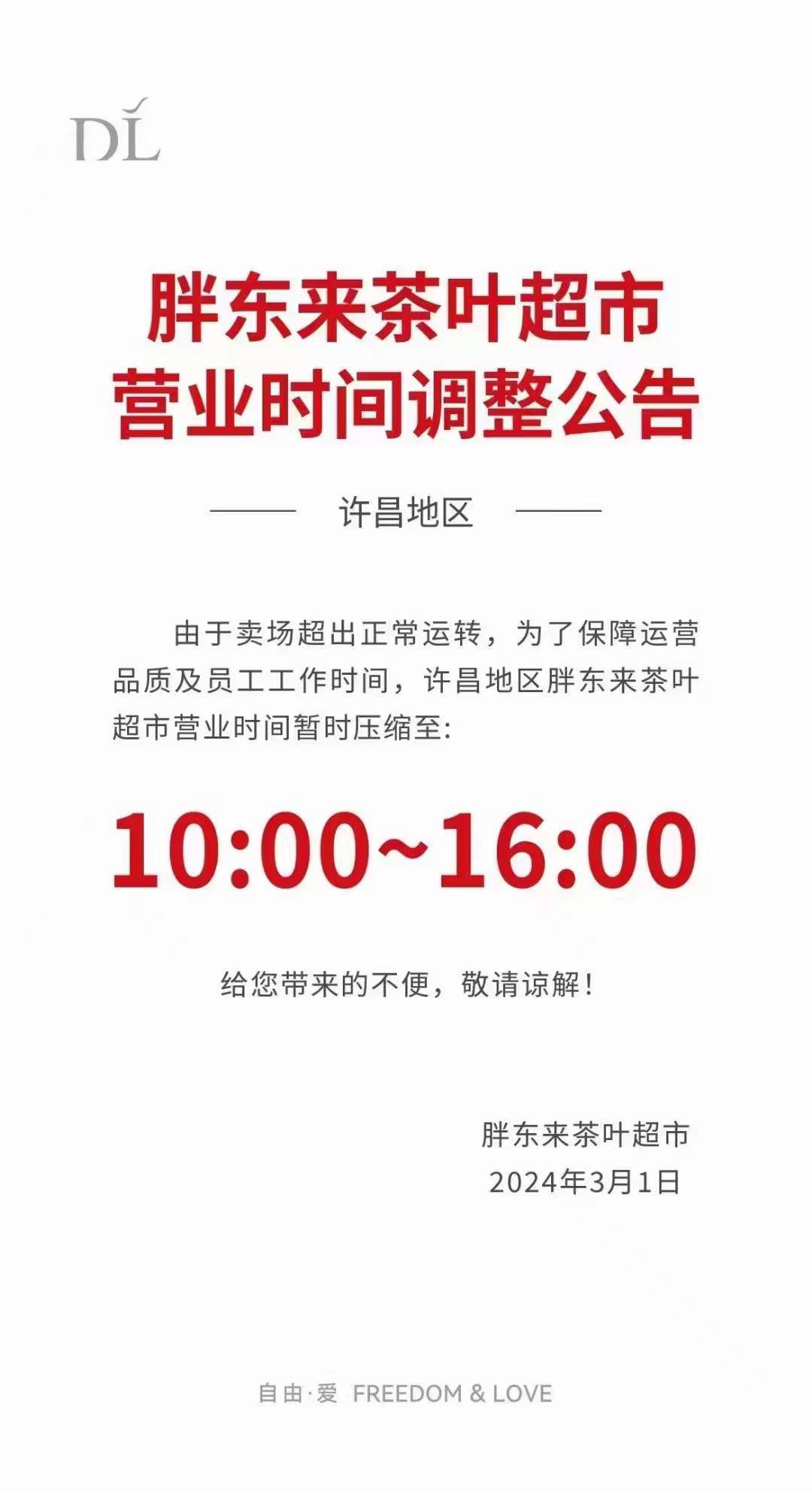 根據(jù)公告,因賣場超出正常運(yùn)轉(zhuǎn),為了確保運(yùn)營品質(zhì)和員工工作時(shí)間,許昌地區(qū)胖東來茶葉超市營業(yè)時(shí)間暫時(shí)調(diào)整為10:00至16:00。