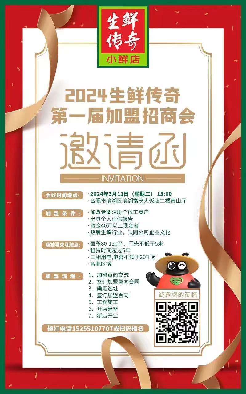 聯(lián)商快訊:3月1日,《聯(lián)商網(wǎng)》從生鮮傳奇獲悉,生鮮傳奇小鮮店第一屆加盟招商會將于3月12日在合肥濱湖富茂大飯店舉行。