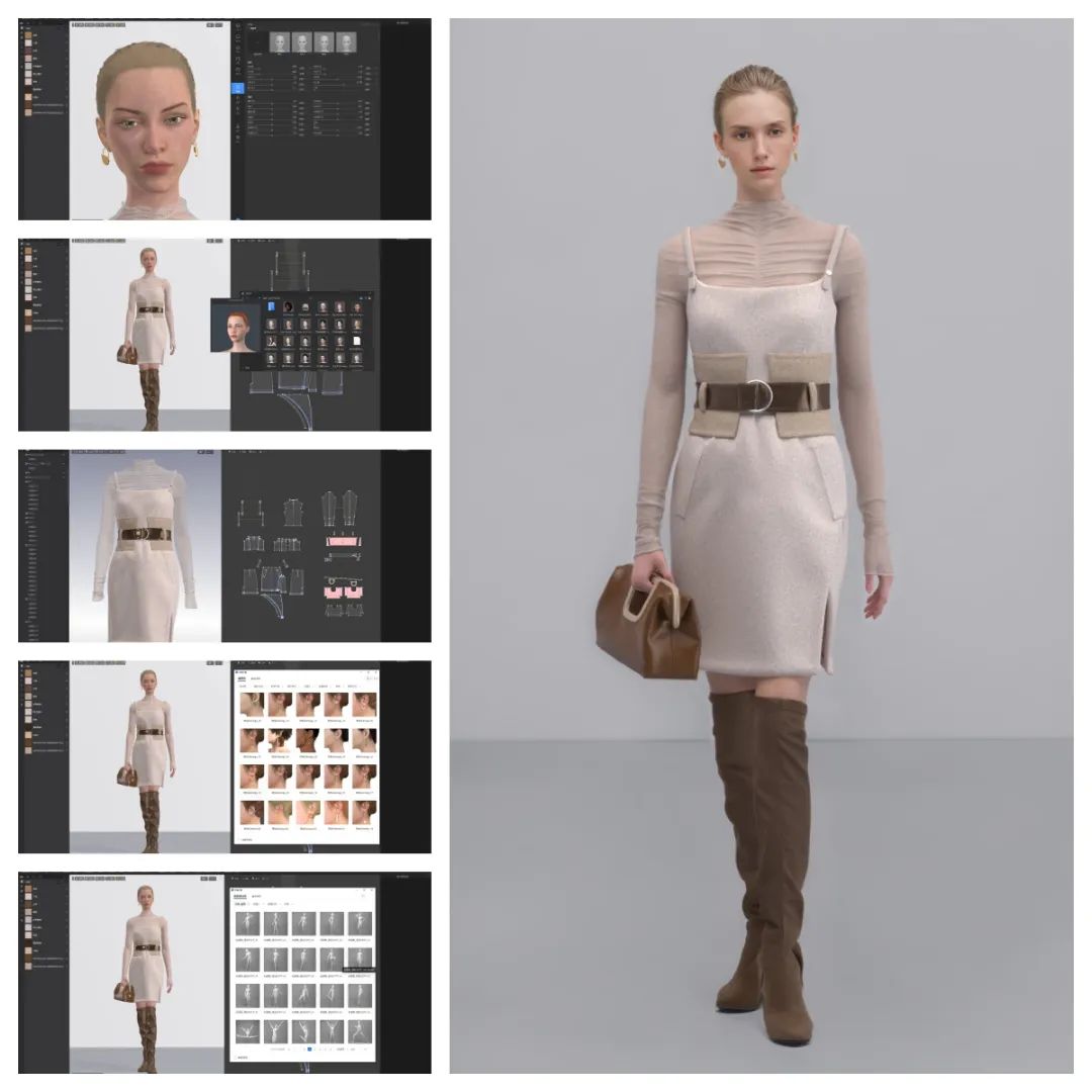 在上身展示環(huán)節(jié),可以調(diào)用Style3D Studio資源庫中的數(shù)字人模特,模特的表情、姿勢、發(fā)型、配飾及背景都可進(jìn)行調(diào)整;