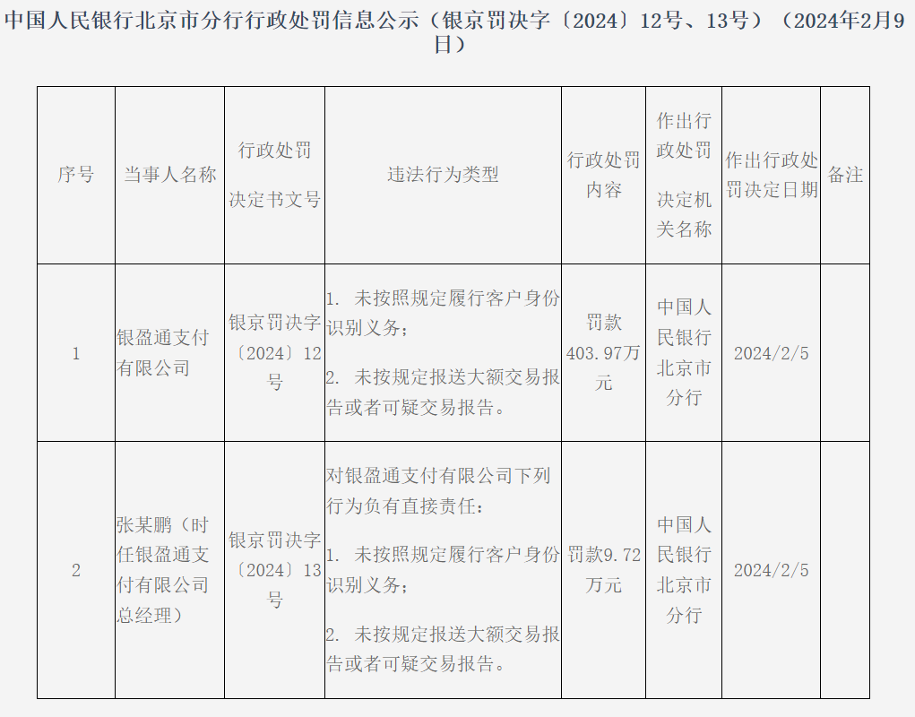 此外,中國(guó)人民銀行北京分行近日發(fā)布對(duì)銀盈通及其總經(jīng)理張某鵬的行政處罰信息,因未按照規(guī)定履行客戶身份識(shí)別義務(wù)和未按規(guī)定報(bào)送大額交易報(bào)告或可疑交易報(bào)告,分別被處罰403.97萬元和9.72萬元。