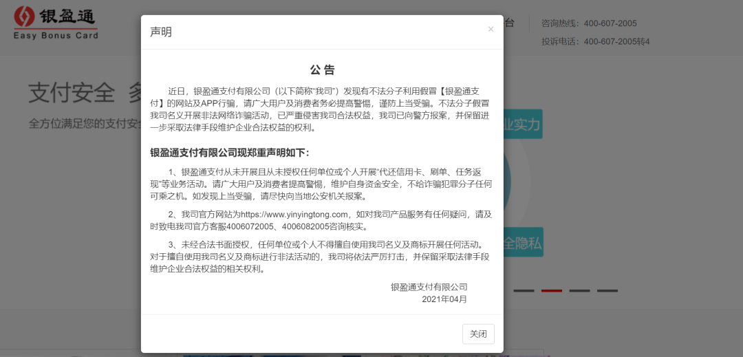時(shí)代周報(bào)記者還注意到,銀盈通官網(wǎng)已疏于更新,謹(jǐn)防上當(dāng)受騙的彈窗公告所寫日期為2021年4月,而公司歷程也還停留在2018年。