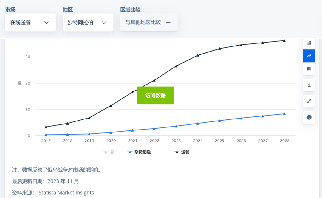 并且,在數(shù)字化基建方面,海灣國(guó)家中最具活力的兩大經(jīng)濟(jì)體沙特、阿聯(lián)酋的互聯(lián)網(wǎng)滲透率超過(guò)99%,分別位居全球第三、第四位;而疫情更急劇加速了中東日常消費(fèi)與生活方式的線上遷移。Statista的數(shù)據(jù)顯示,在疫情開始的2020年,沙特的外賣收入開始加速增長(zhǎng),目前正以6.02%的復(fù)合年增長(zhǎng)率迅速擴(kuò)大市場(chǎng)。