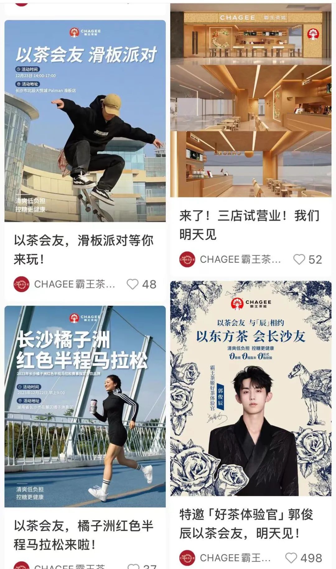 去年12月,霸王茶姬長沙開啟試營業(yè),前后釋放多個營銷連招。最初借助“以茶會友”,進(jìn)入芒果TV和中南林業(yè)大學(xué)、湖南工商大學(xué)等地方舉辦小型活動,而后,也在長沙半程馬拉松、時裝周和于文文演唱會等活動中刷臉。國金街A層店面開啟試營業(yè)后,則前后有郭俊辰、翟瀟聞和陳星旭等年輕明星舉辦“好茶體驗官”見面會。