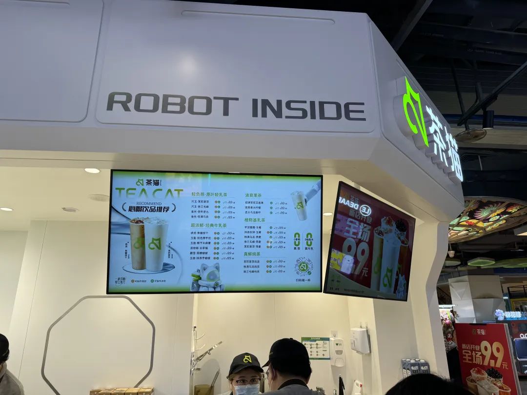 顯眼的機(jī)械臂正忙著出品,傳遞出的科技感滿滿,在門(mén)店右側(cè)完成下單后,兩只藍(lán)白相間的機(jī)械臂隨即開(kāi)始工作,從取空杯,到制作飲品,再到塑封,均交由機(jī)械臂完成。