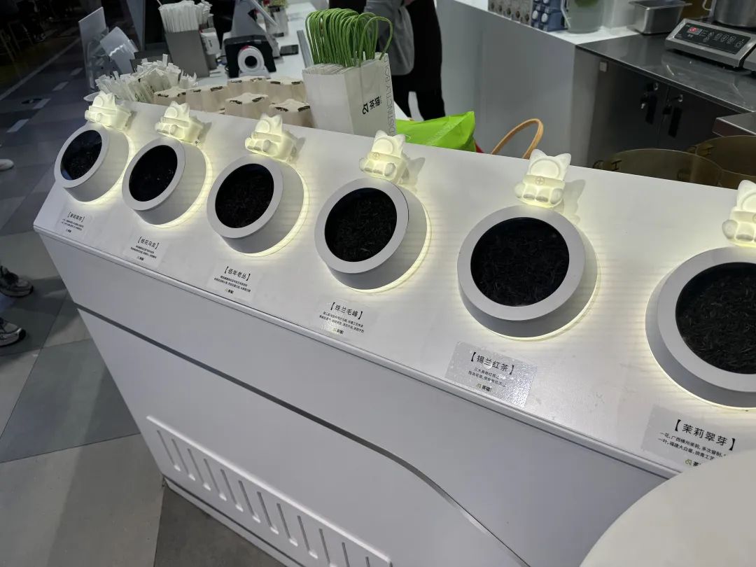 與霸王茶姬類似的還有,茶貓同樣給茶飲所用的基底預(yù)留了“展覽”位置。茶貓所用的茉莉翠芽、桂花烏龍、佰年老叢、珠蘭毛峰等原葉便一清二楚。區(qū)別在于霸王茶姬冰茶的每款茶葉介紹以懸掛小牌的方式展示,茶貓的每款原葉展示,以獨(dú)立的小格子進(jìn)行劃分,不同原葉下面配有文字說(shuō)明。