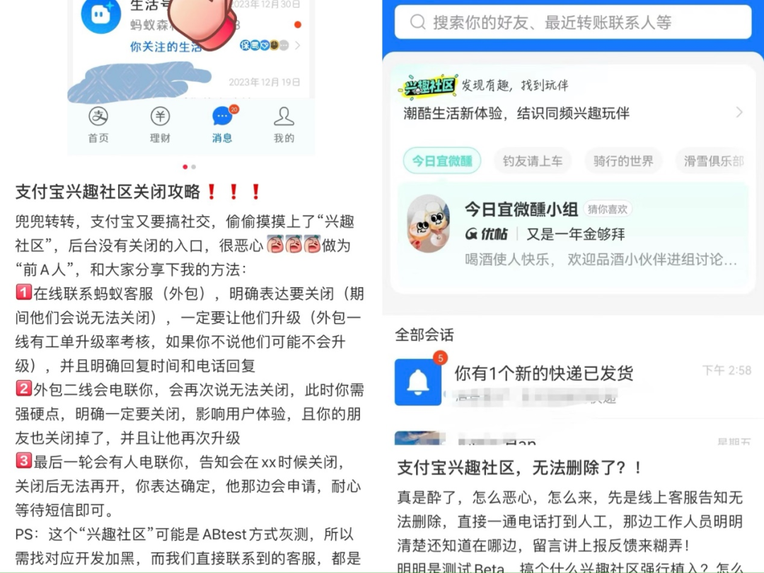 而另一位網(wǎng)友則發(fā)布了“支付寶興趣社區(qū)關(guān)閉攻略”,該筆記提到,“兜兜轉(zhuǎn)轉(zhuǎn),支付寶又要搞社交,偷偷摸摸上了興趣社區(qū),后臺(tái)沒(méi)有關(guān)閉的入口,很惡心!倍鴵(jù)其攻略,關(guān)閉興趣社區(qū)的流程較為復(fù)雜,需要經(jīng)過(guò)多輪與客服的溝通,并要態(tài)度堅(jiān)決。