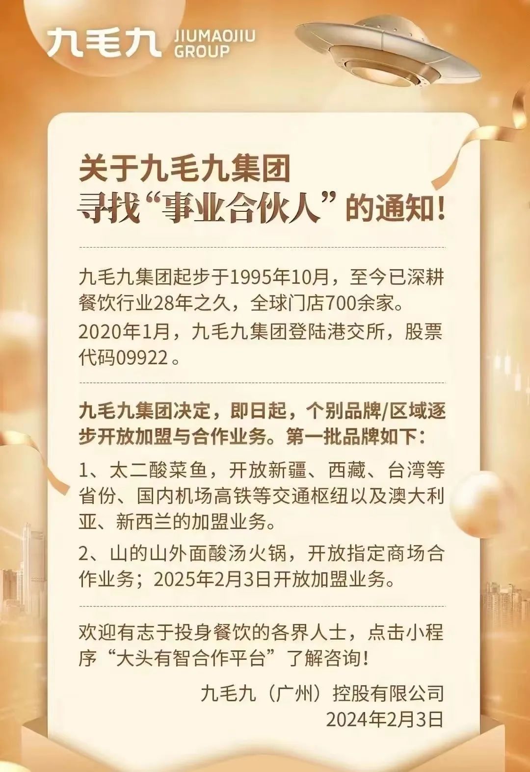 2024年2月3日,九毛九宣布自2024年2月1日起,逐步開(kāi)放旗下太二酸菜魚(yú)和山的山外面酸湯火鍋的加盟與合作業(yè)務(wù),這標(biāo)志著九毛九從以直營(yíng)為主向多元經(jīng)營(yíng)模式轉(zhuǎn)變。