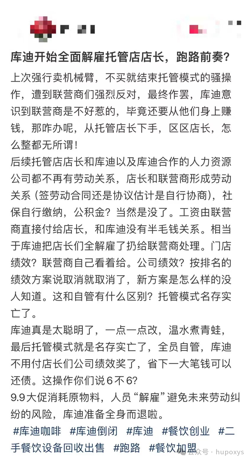還有人爆料稱庫(kù)迪開(kāi)始全面解雇托管店店長(zhǎng),之后托管店店長(zhǎng)與庫(kù)迪及庫(kù)迪合作的人力資源公司都不再有勞動(dòng)關(guān)系,工資由聯(lián)營(yíng)商直接付給店長(zhǎng),托管模式名存實(shí)亡。