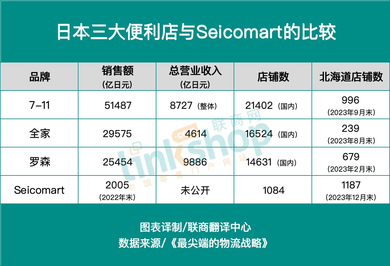 Seicomart在北海道179個市町村中的175個市町村開設了門店,覆蓋了當地總人口的99.8%,而7–11僅覆蓋120個市町村。