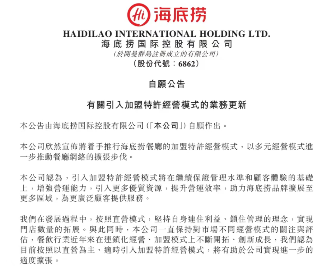 堅(jiān)持30年直營的海底撈給出了自己的答案,它也放加盟了!