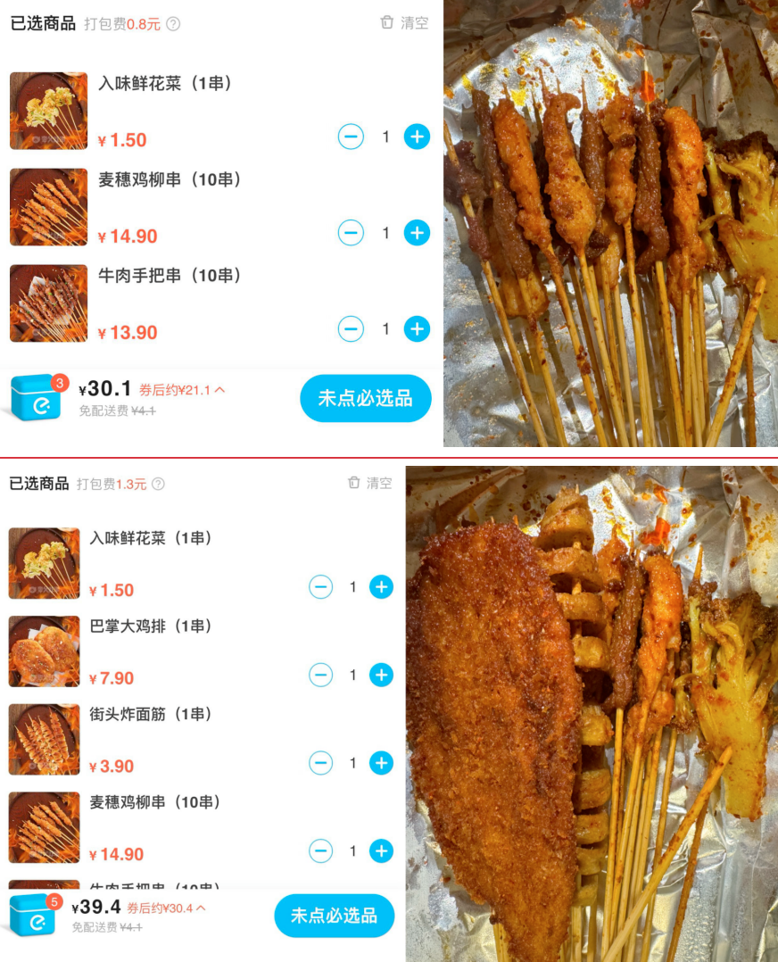 觀潮新消費(fèi)記者在外賣平臺(tái)選購后發(fā)現(xiàn),30元價(jià)位只能選擇2份肉類和一串蔬菜類;疊加平臺(tái)優(yōu)惠后,可以再增加一個(gè)雞排和一串炸面筋。