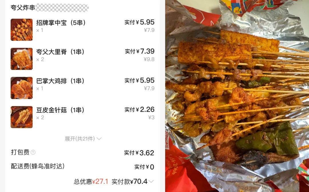 上述截圖中的視頻博主,在2022年9月購買了夸父炸串門店中的所有品類,共計(jì)38種串串(有些品類是5串或10串一份)和一份雞排,總價(jià)211元,疊加多種優(yōu)惠券后實(shí)付128元。