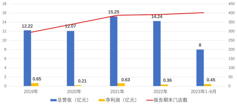 2023年上半年,公司經(jīng)營情況基本恢復正常,營收同比增長21.6%至8億元,毛利率同比提升3.89個百分點,但半年里只新增了10家門店。