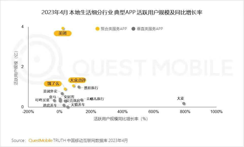 從上圖也不難看出,原與美團(tuán)進(jìn)行全面對標(biāo)的聚合類服務(wù)APP餓了么,現(xiàn)活躍用戶規(guī)模及同比增長率數(shù)據(jù)更貼近于美團(tuán)旗下垂直類服務(wù)APP美團(tuán)外賣。