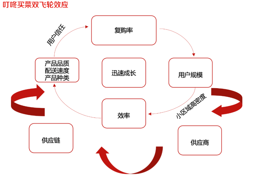 新眸曾從理論上解讀過能支撐叮咚買菜增長的“雙飛輪模式”,用更好的用戶體驗(yàn)吸引新用戶,進(jìn)一步驅(qū)動(dòng)采購增加,此時(shí)總訂單增長,而從供應(yīng)端角度,規(guī)模性的訂單能夠提升對(duì)上游的議價(jià)能力;另一個(gè)飛輪是對(duì)已有數(shù)據(jù)進(jìn)行分析,進(jìn)一步優(yōu)化運(yùn)營細(xì)節(jié),提升運(yùn)營效率。