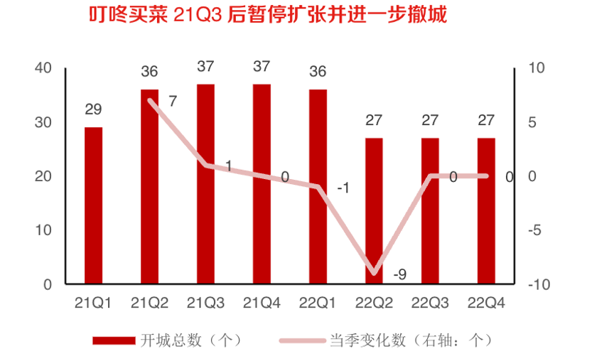 2022年,叮咚買菜接連關(guān)閉了珠海、唐山、宣城、天津、廈門等站點(diǎn);2023年前后又暫停了成都、重慶、西南市場的運(yùn)營,以及關(guān)閉了廣州、深圳共38個(gè)站點(diǎn)。當(dāng)前的叮咚買菜App上,包括蘇州、上海、北京在內(nèi),已開通的城市有25個(gè),其中江浙一帶占據(jù)大頭,較高峰期的37座城市縮水近30%。