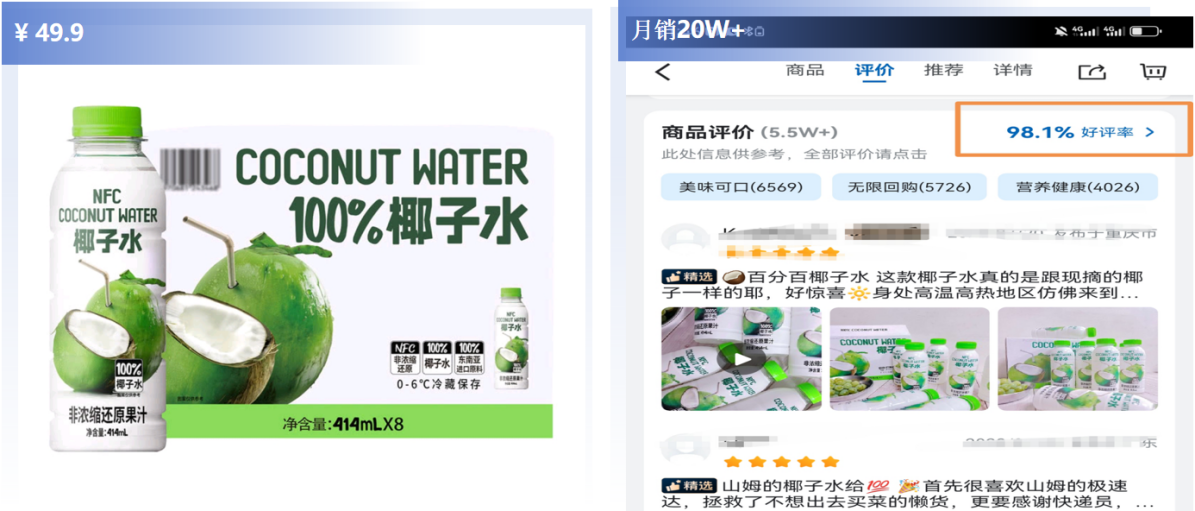 推薦理由:原料健康,精選東南亞進口原料,100%椰子水,清爽像新鮮椰子水,口感深受用戶喜愛,風(fēng)味果汁銷量TOP1。