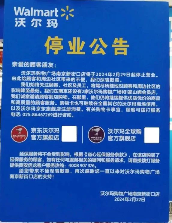 2月29日,沈陽沃爾瑪長青店突發(fā)公告稱,將于3月7日停止營業(yè);沃爾瑪荊州北京中路店2月27日停業(yè);沃爾瑪南京首店于2月29日起停止營業(yè);江西鷹潭沃爾瑪超市3月5日起停止營業(yè)。