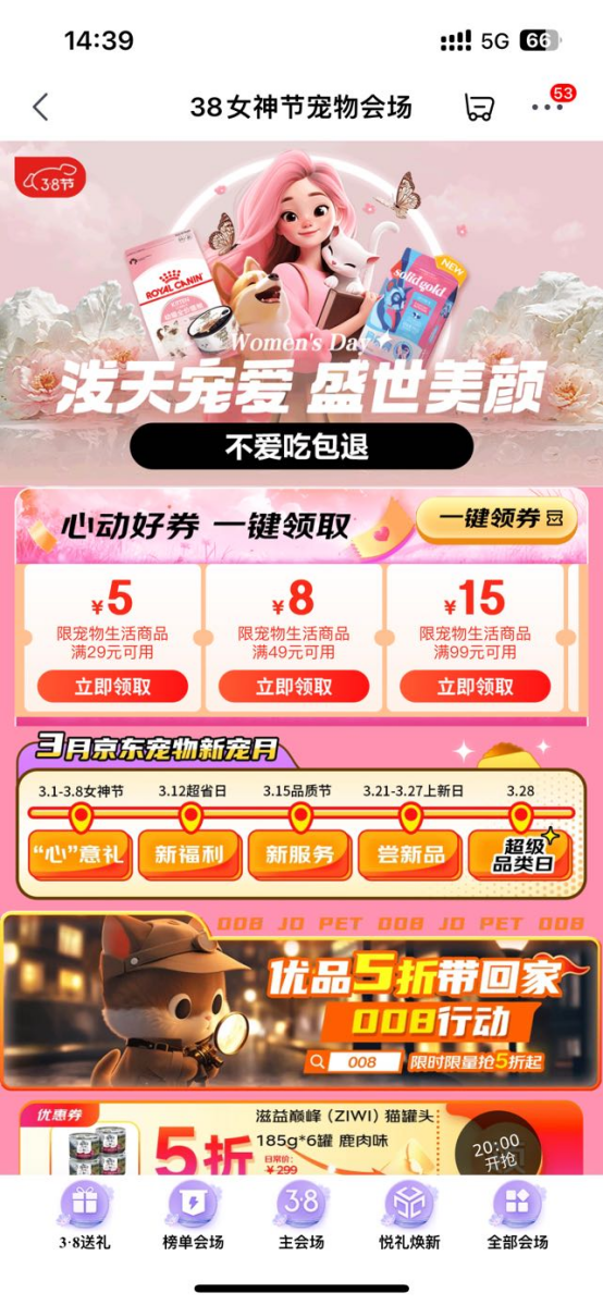 在婦女節(jié)上線的“三八節(jié)”專場(chǎng)中,也有“不愛吃包退”服務(wù)專屬版塊,集合鮮朗全階段低溫烘焙貓糧4斤裝、渴望雞肉味貓糧5.4kg、伯納天純中/大型犬全價(jià)成年犬糧15kg等覆蓋寵物、休閑食品、糧油等品類產(chǎn)品;顒(dòng)期間,消費(fèi)者只需登錄京東APP,搜索“不愛吃包退”即可進(jìn)入會(huì)場(chǎng),通過專屬版塊,享受“不愛吃包退”服務(wù)。