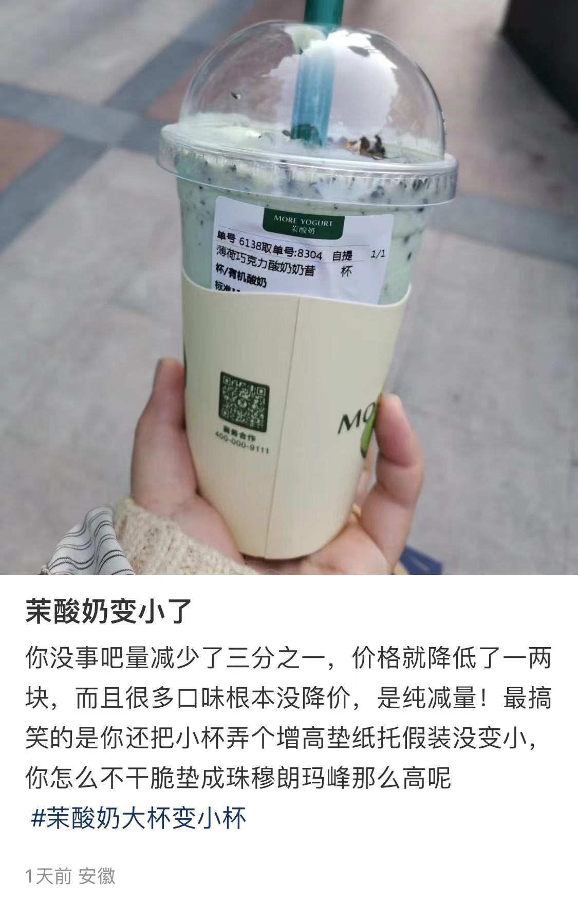 聯(lián)商快訊:近日,有不少網(wǎng)友發(fā)文吐槽茉酸奶的杯子變小了,但是價(jià)格依然很貴。有網(wǎng)友直言“大杯變小杯,但價(jià)格沒變”。