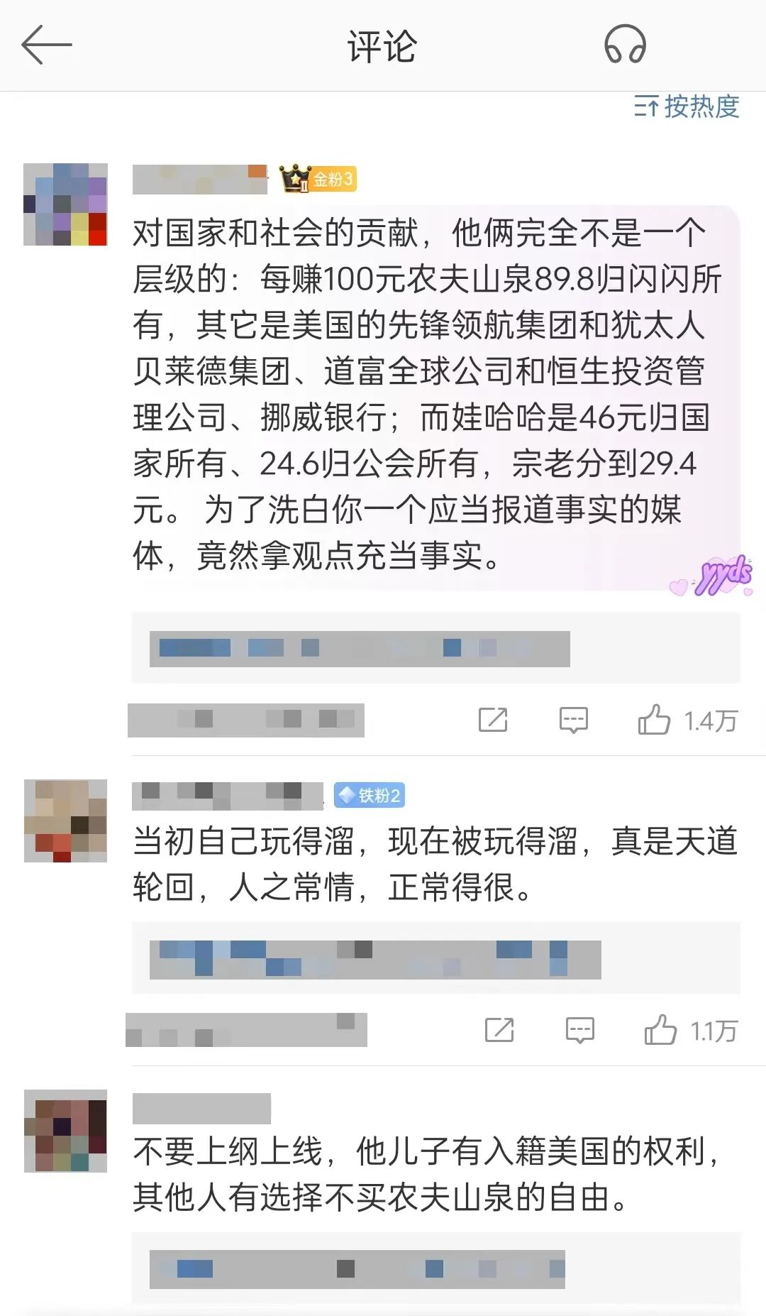 在微博鳳凰網(wǎng)《誰在圍剿農(nóng)夫山泉》文章的評論區(qū),有一個超過700贊的回復(fù):“不用找了,就是我在圍剿”;卮鹫卟皇侨魏未骎,而是普通用戶,但此言一出,應(yīng)者云集。