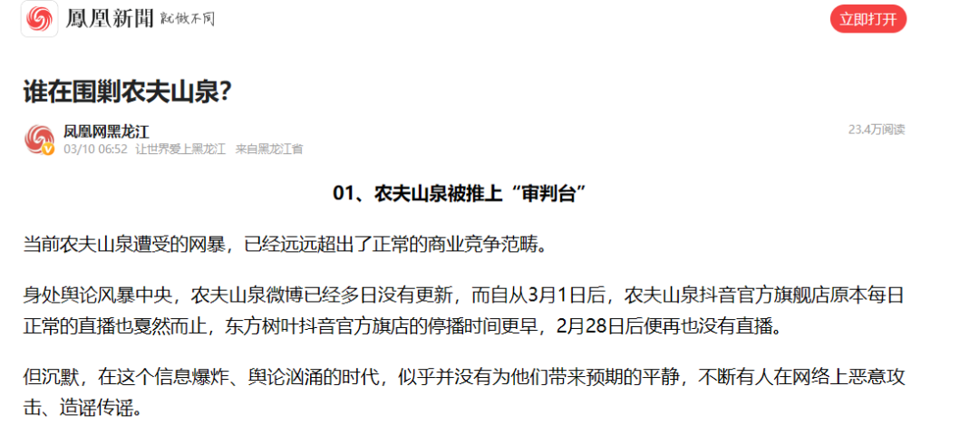 我個人始終尊重任何基于事實做分析解讀的媒體。但就事論事,鳳凰網(wǎng)這篇文章,實際上是揚湯止沸,農(nóng)夫山泉甚至被架在輿論的對立面。