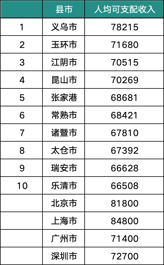 從表格里可以看出,義烏不論是城鎮(zhèn)居民還是農民,都比北上廣深來得高,義烏能賺錢也能花錢,有些消費給人的體感會比很多大城市來得高,而且義烏城鎮(zhèn)人均可支配收入比北上廣深都高很多,這種縣城做商業(yè)機會非常多。
