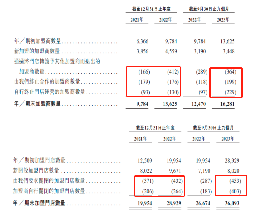 同時招股書中披露了另外一組數(shù)據(jù),2021、2022和2023年前三季度蜜雪冰城加盟商門店的關(guān)店數(shù)量分別為577家、696家和856家,同一時期因轉(zhuǎn)讓和終止合作而退出的加盟商數(shù)量則分別為438家、718家和792家,幾乎呈現(xiàn)1:1的規(guī)律也能看出大多數(shù)退出的加盟商都是只開了1~2家門店的“新手”。
